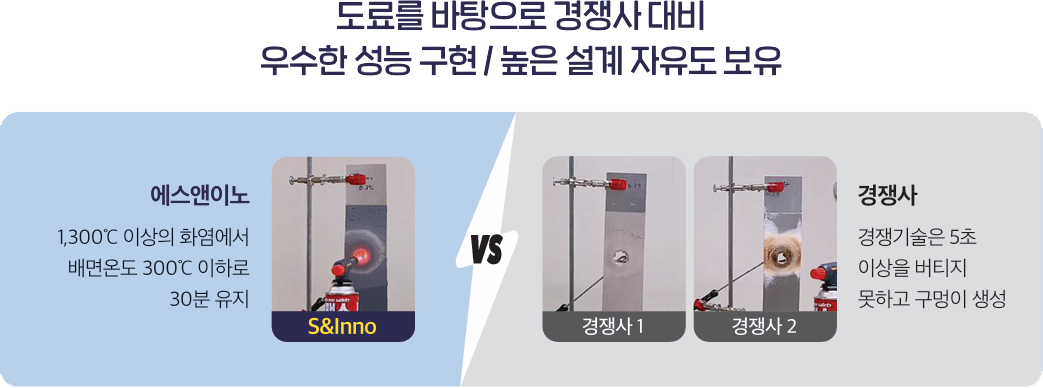 에스앤이노의 기술력은 도료를 바탕으로 1300℃ 이상의 화염에서 배면 온도 300℃ 이하로 30분 동안 유지됩니다.
